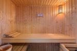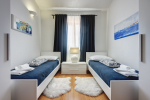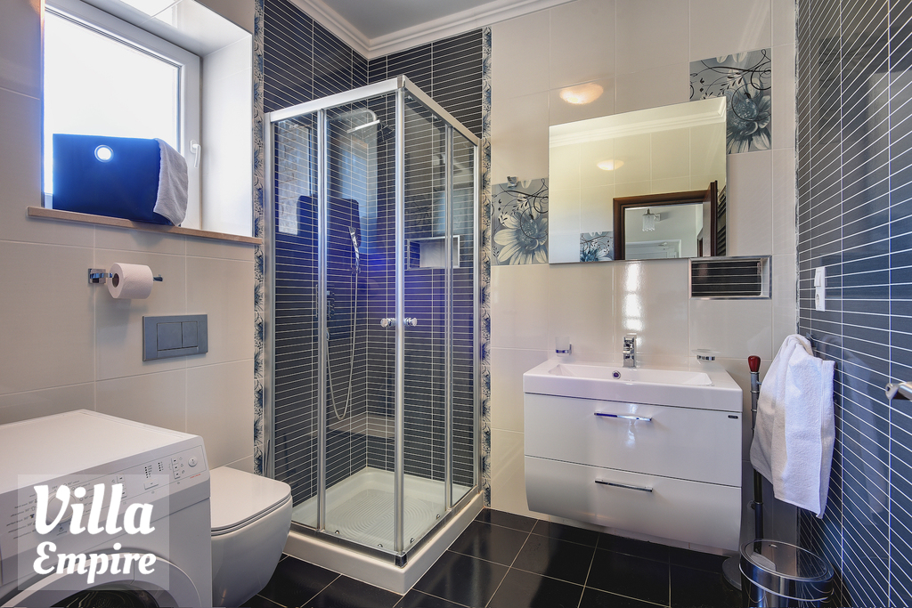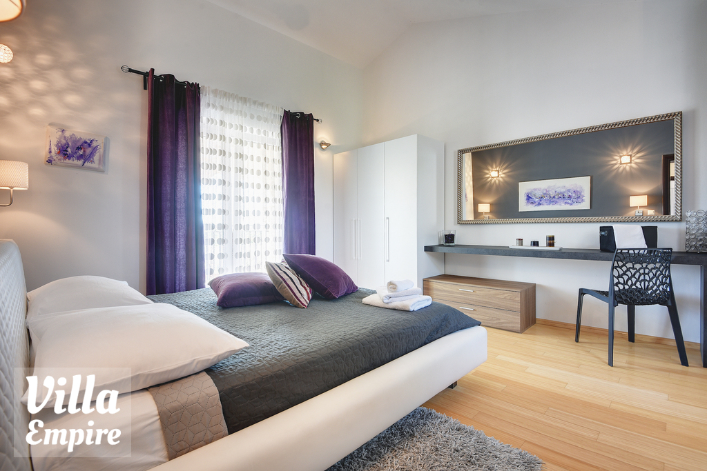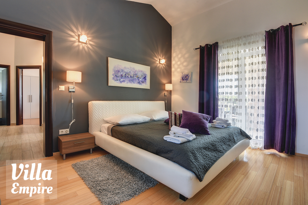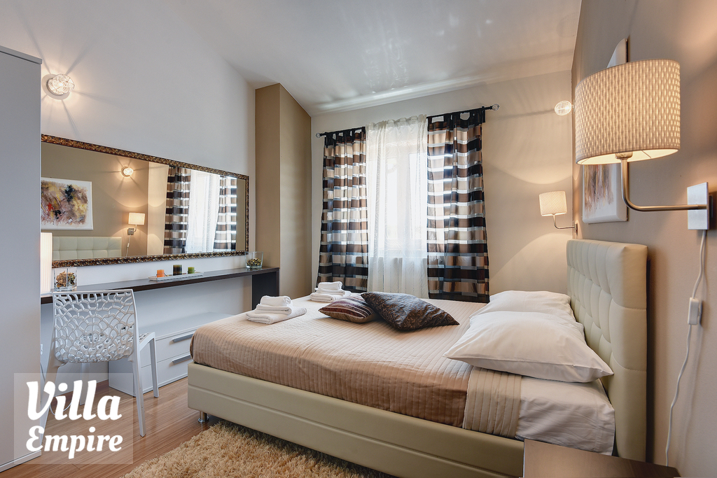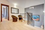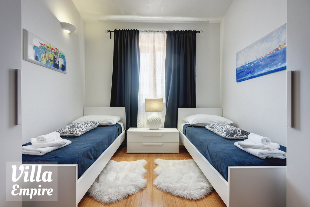 Bedrooms – All three bedrooms are on the upper floor. Two of them have double beds, while the third has two single beds. There is also a baby cot and a sofa bed, providing sleeping for up to 8 guests. There are side tables, lamp shades, sitting, and wardrobes with ample storage and hanging space. Large mirror make the rooms appear more spacious. Wooden and carpeted flooring. Paintings decorate the walls.