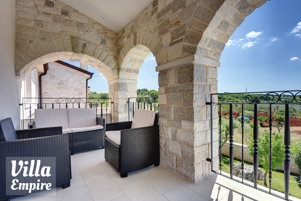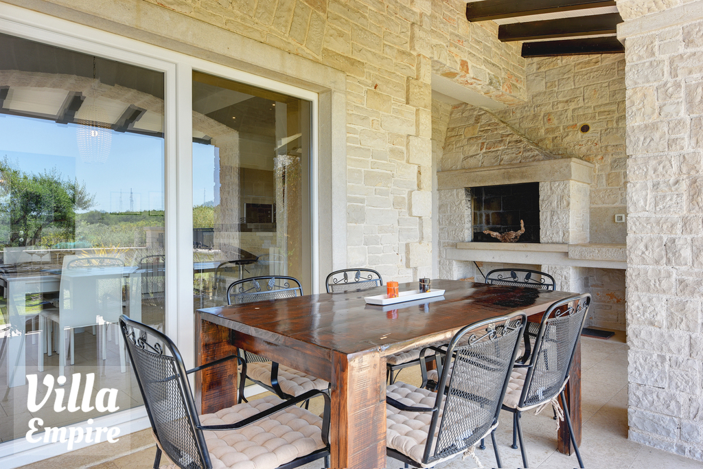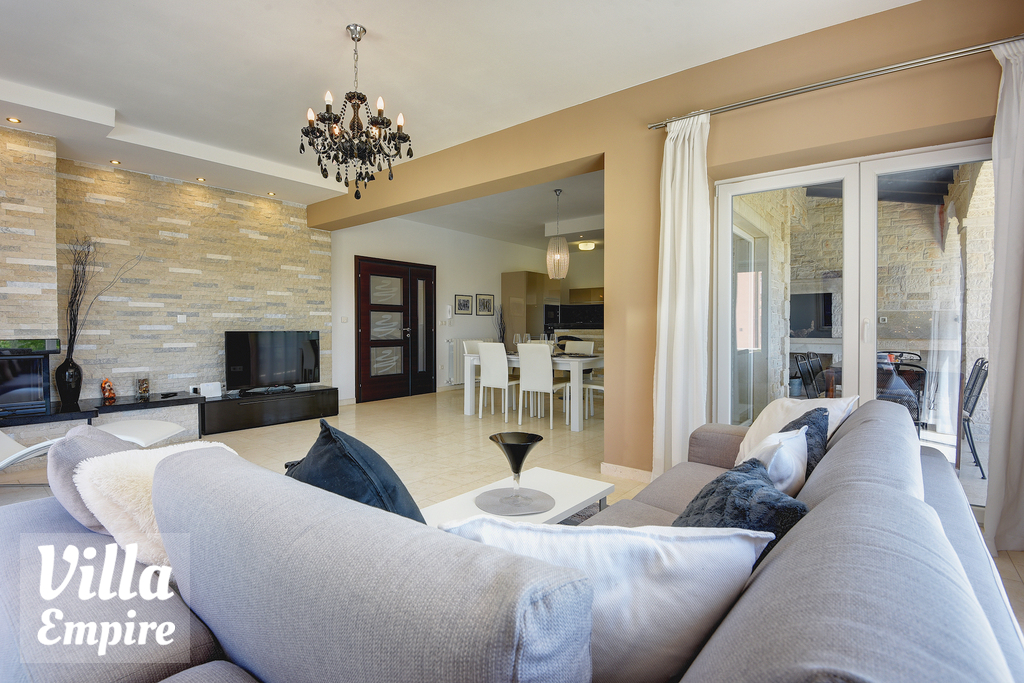 Living Room – On entering the house, you will reach the spacious living/dining room. There is a L-shaped cushy sofa around a modern coffee table. An antique chandelier hangs from the ceiling. This section of the house has wide glass windows and doors, so you will always get nice outdoor views. You will also find a satellite television and fireplace. There is lounging space also in the upper flor balcony.